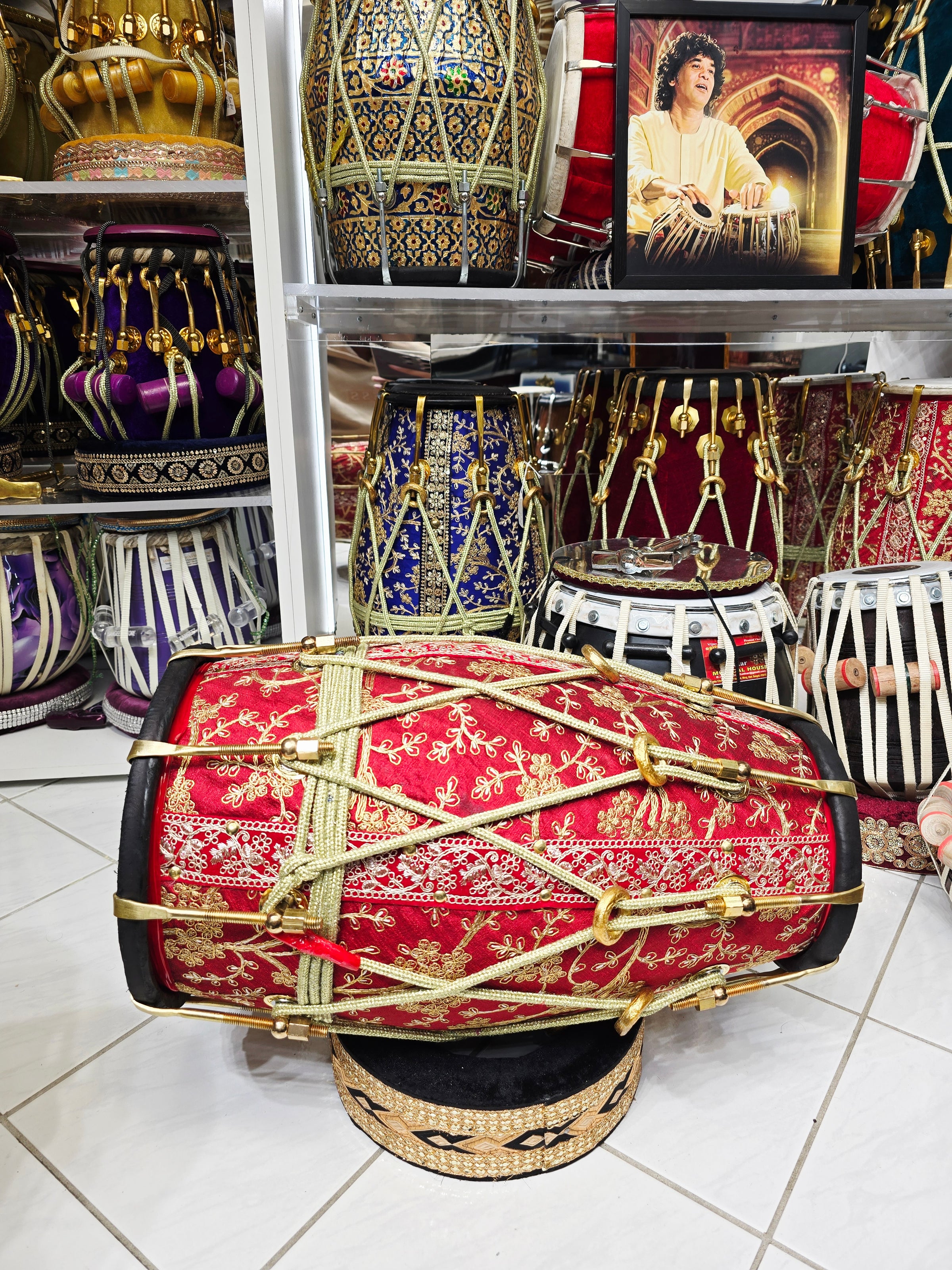 The RangMahal™ Premium Dholak is a 19.4 lb concert-weight instrument crafted from solid red sheesham and finished in a striking red and gold sherwani wrap with black skins for a bold, stage-ready look. Its heavier build delivers a deep, powerful low end with clear projection, making it well suited for live performance, bhajan, folk, and ensemble playing. Visually regal and tonally commanding, this dholak is designed for players who want presence, durability, and a strong rhythmic foundation in a premium build.