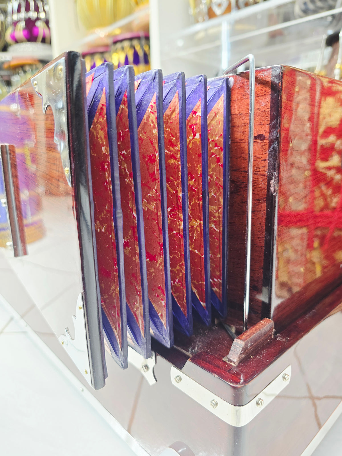 An absolutely beautiful BMF (Bass/Male/Female) 3-Reed 9-Scale Changer Premium Traditional Harmonium. The finest crafted harmoniums available in the world. We have worked tirelessly to narrow down the most skilled, creative, responsible, and trustworthy makers to source our Premium Harmoniums. Each Harmonium is quality checked, tuned, maintained and tested to guarantee optimal performance, response & durability. We are proud to present to you, Sangeet Store's collection of World Class Premium Harmoniums. These Premium Harmoniums are distributed every week, and the limited edition items are always changing. Individual Video and picture samples are provided for every Premium Harmonium,
