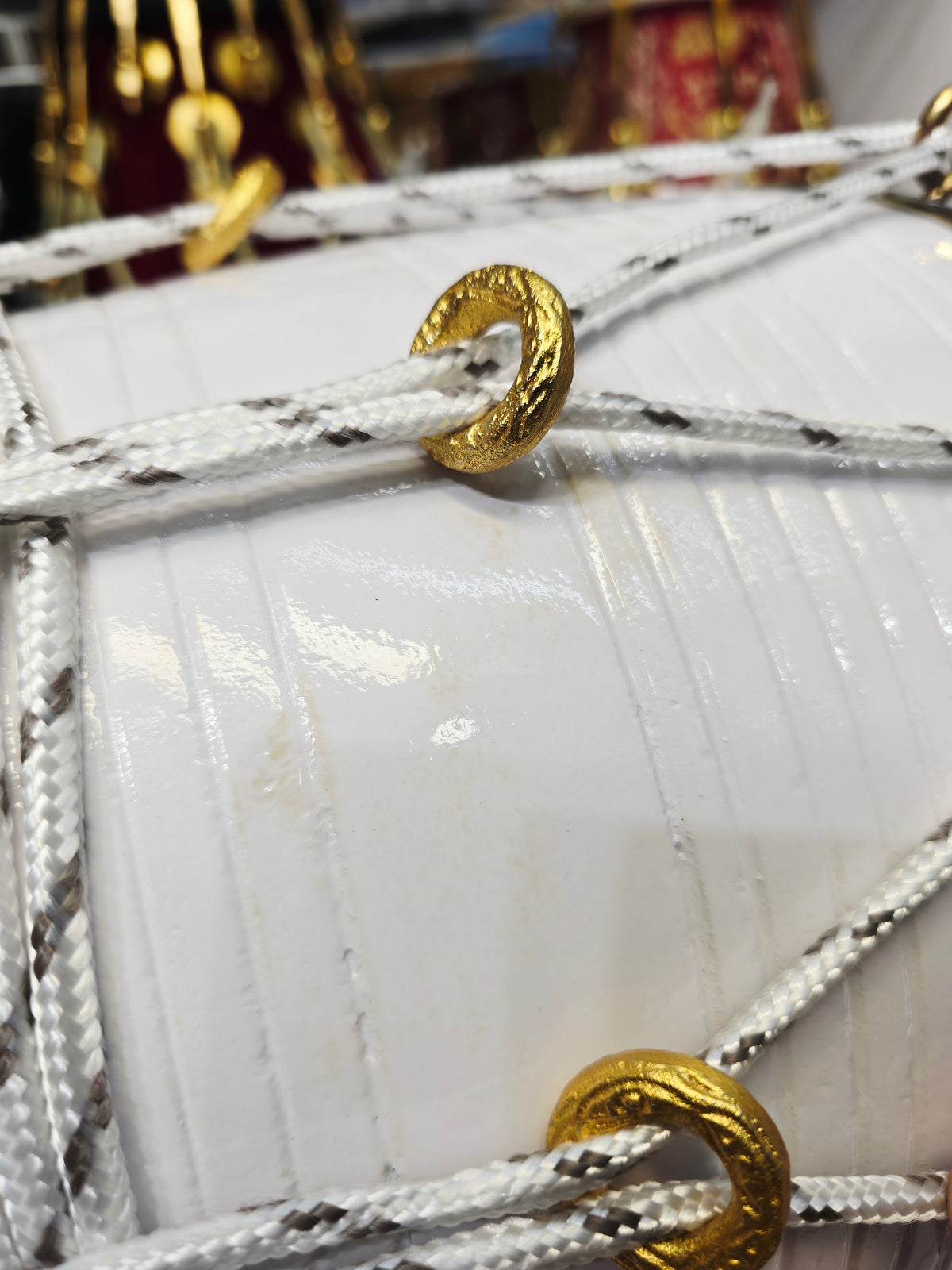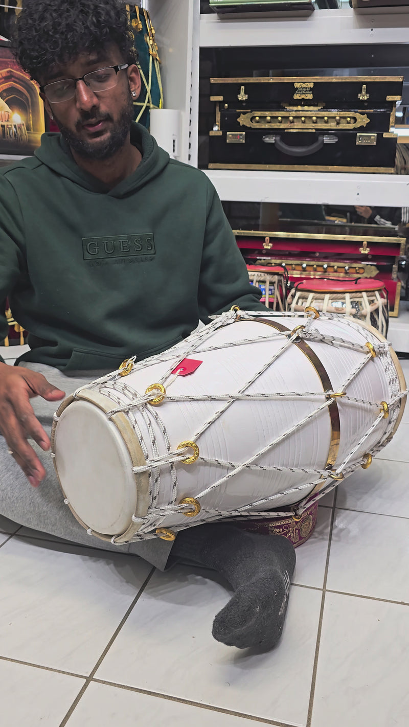 A lightweight 22.5″ West Indian dholak crafted from solid red sheesham, finished in a clean white paint finish. Weighing 14.4 lbs, it offers exceptional tonal clarity with a punchy bass, balanced mids, and crisp attack—well suited for chutney, bhajan, and live performance. Minor cosmetic blemishes only, purely visual with no impact on sound or playability.