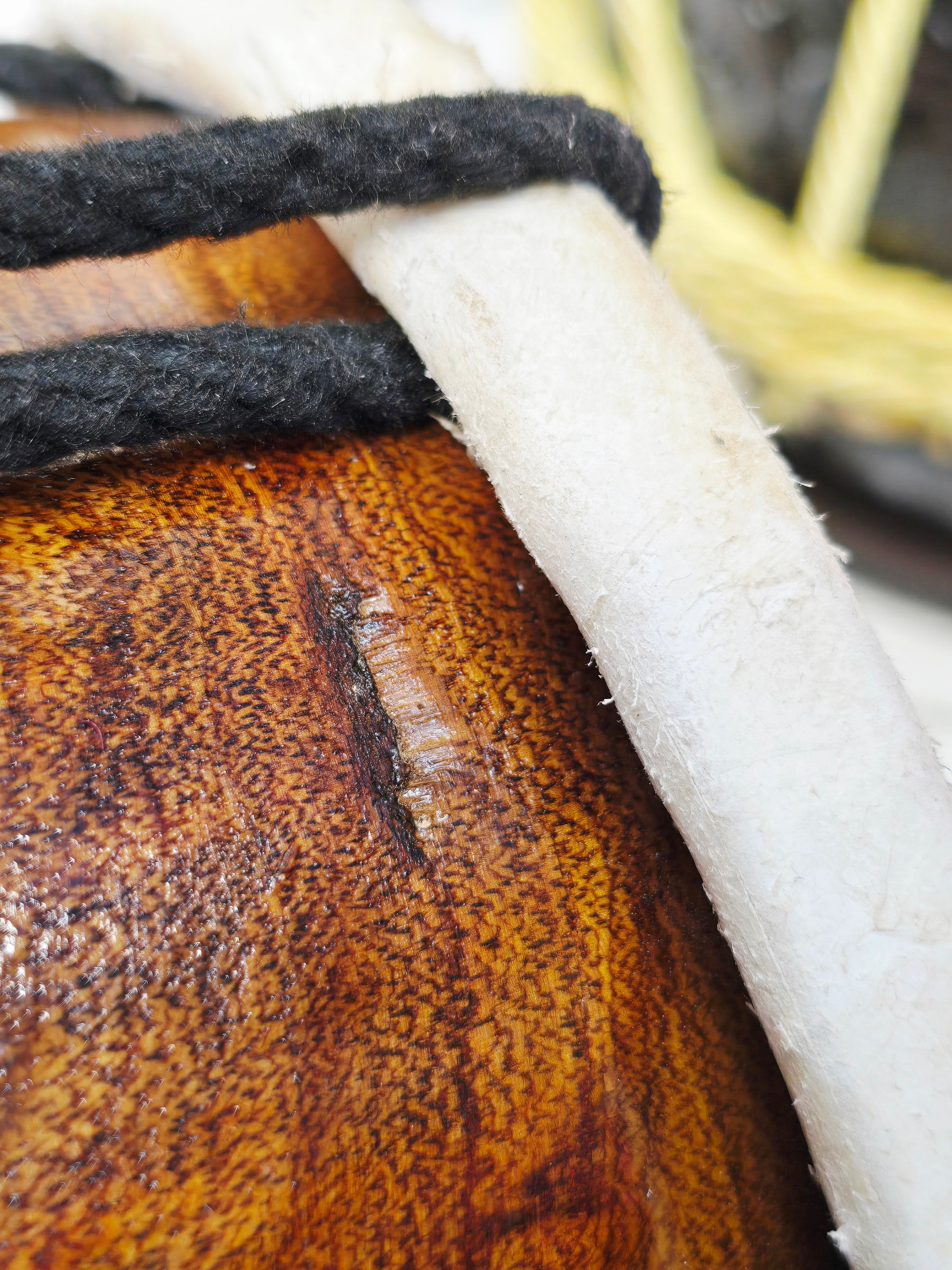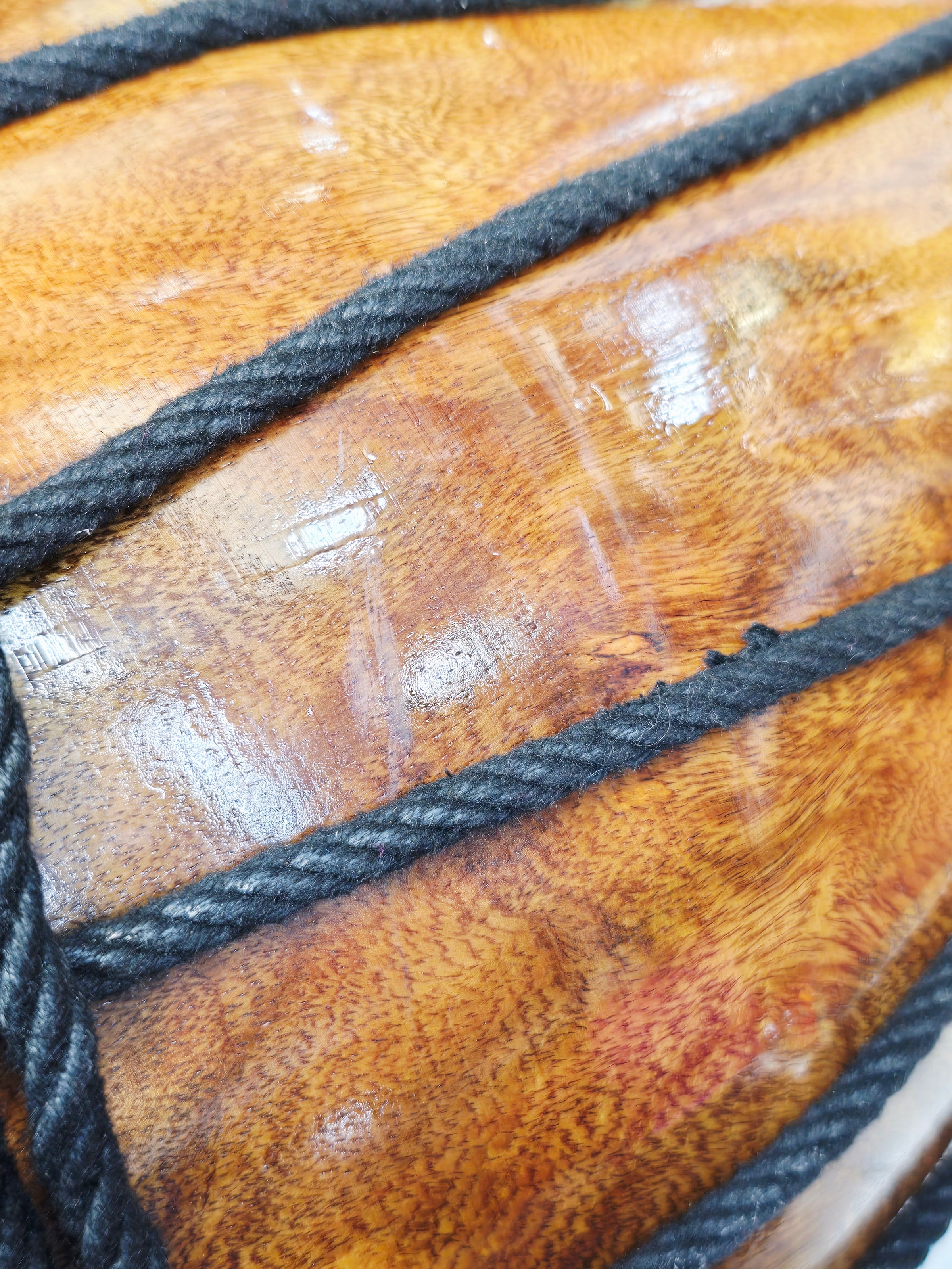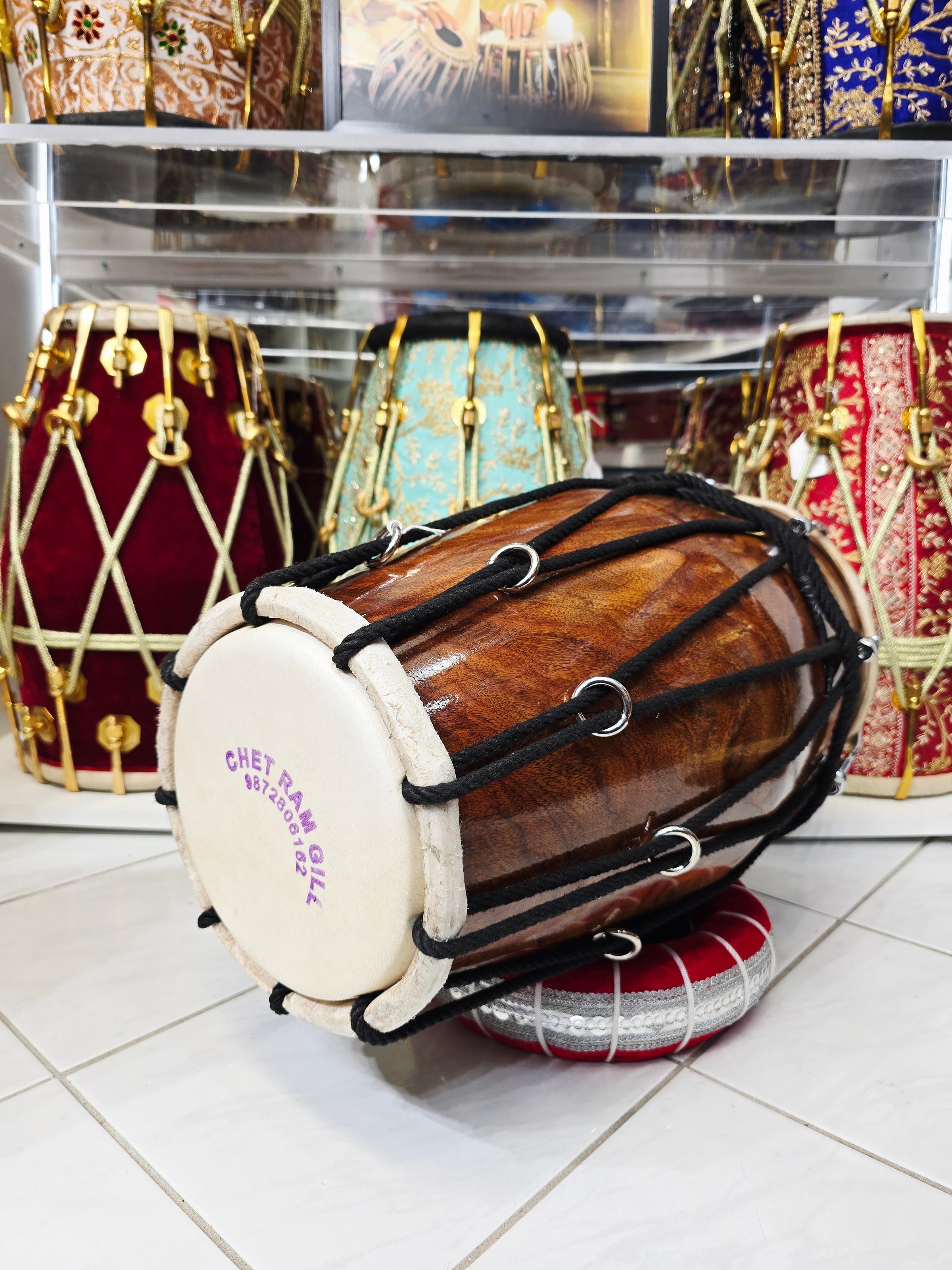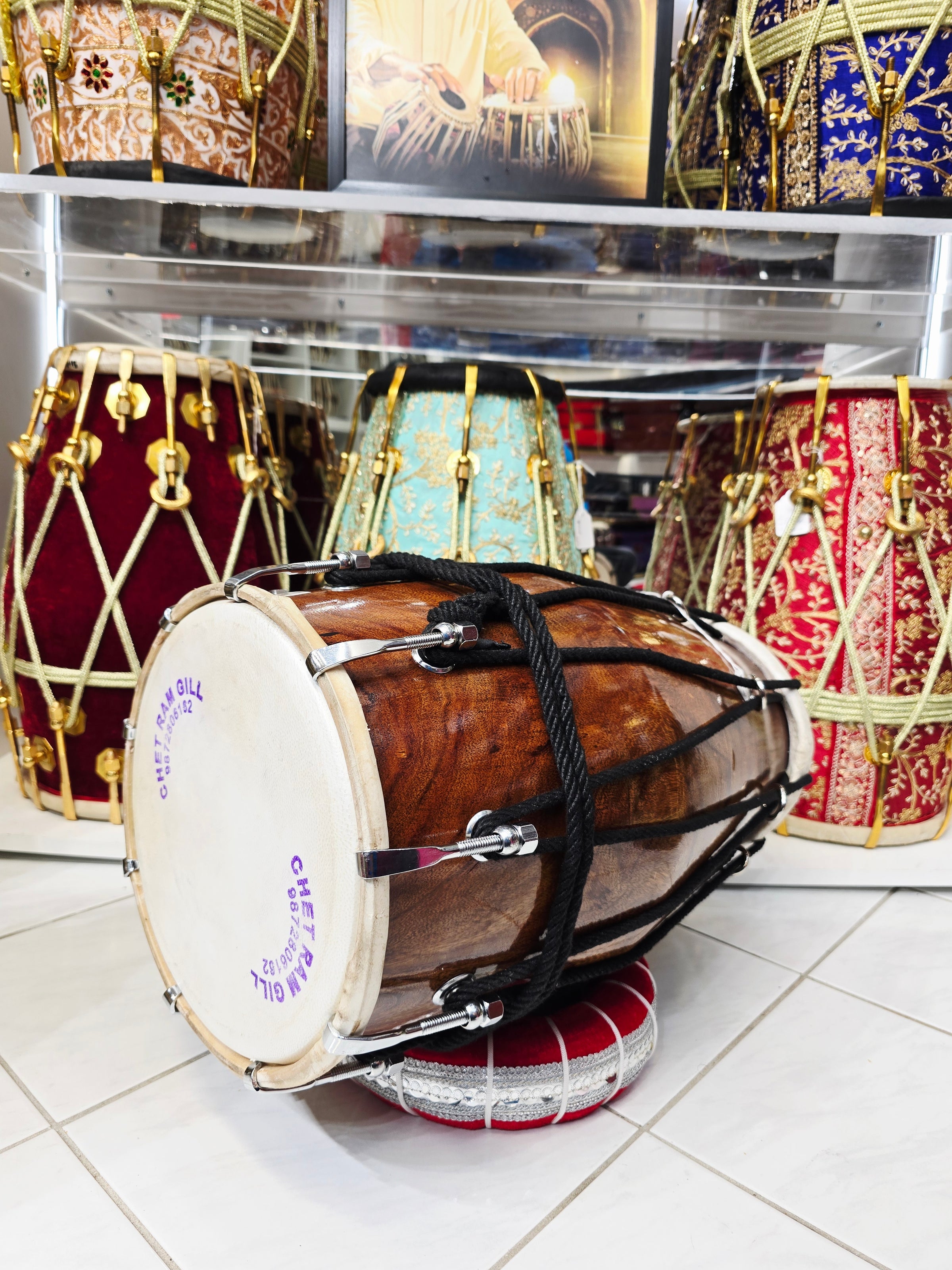 Trishakti is an 18.5″ long, 12.8 lbs dholak crafted by Chetram Gill, designed in a rare hybrid construction that combines half roped and half bolted tuning. This dual design blends the traditional warmth and flexibility of rope lacing with the modern stability and precision of bolt tuning. Handcrafted from red sheesham, it delivers a resonant bass with clear treble articulation, making it versatile for both studio and stage use. Its unique build and balanced tone make it an outstanding choice for players seeking innovation rooted in tradition.