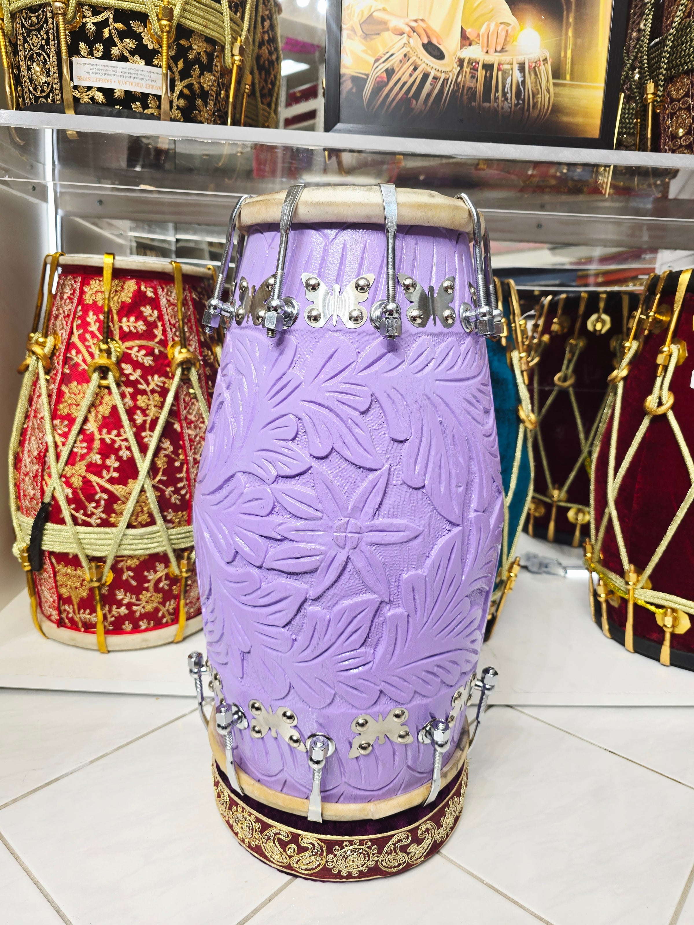 Lavanya – 15.2lbs Lavender Encarved Red Sheesham Concert Dholak | Silver Flora Hardware