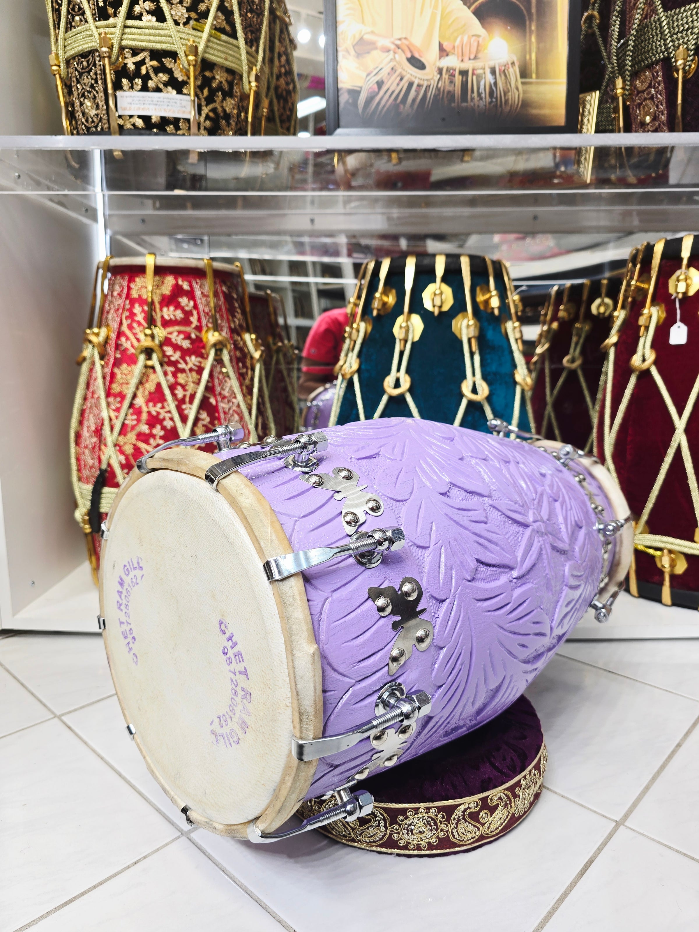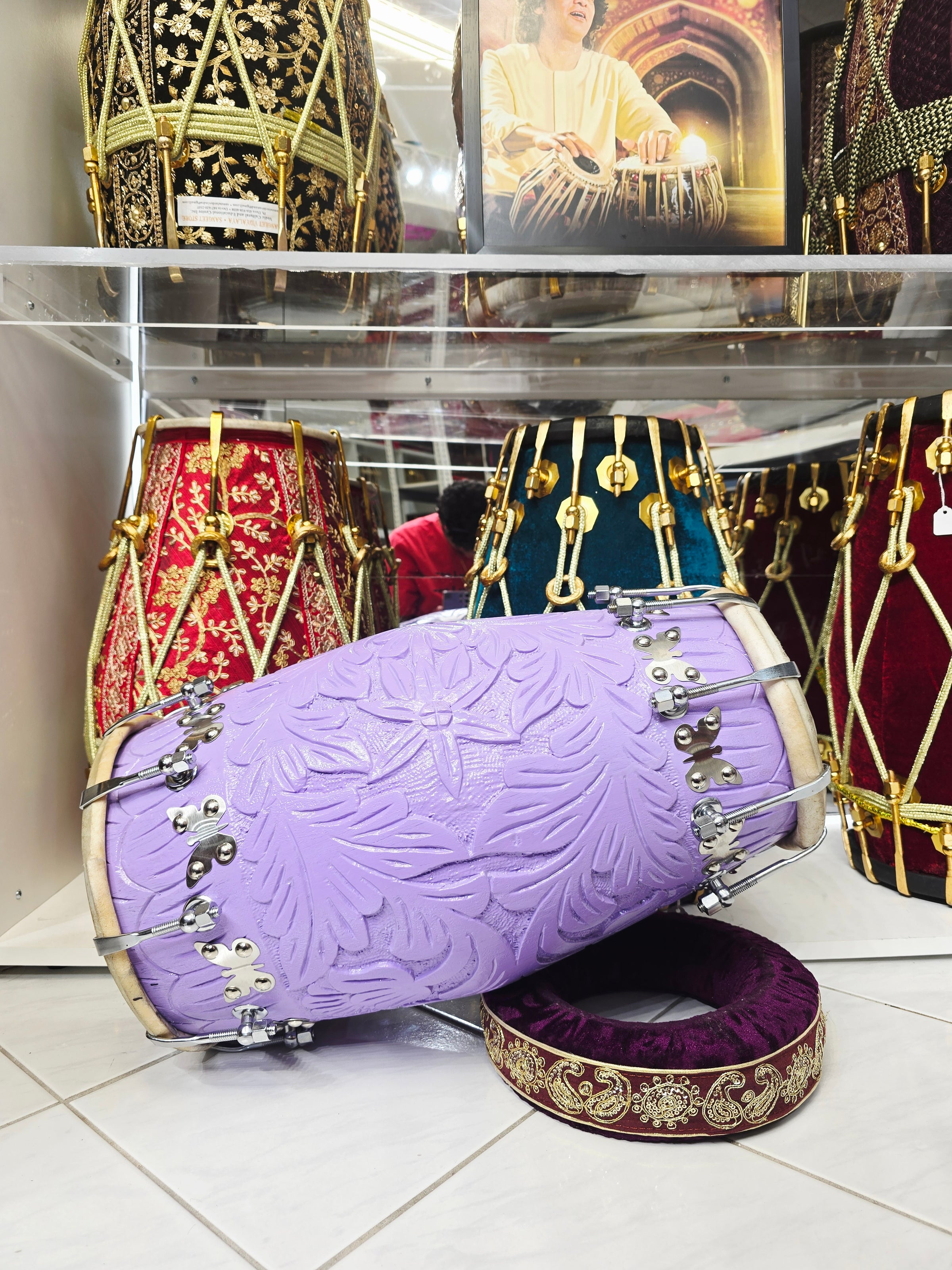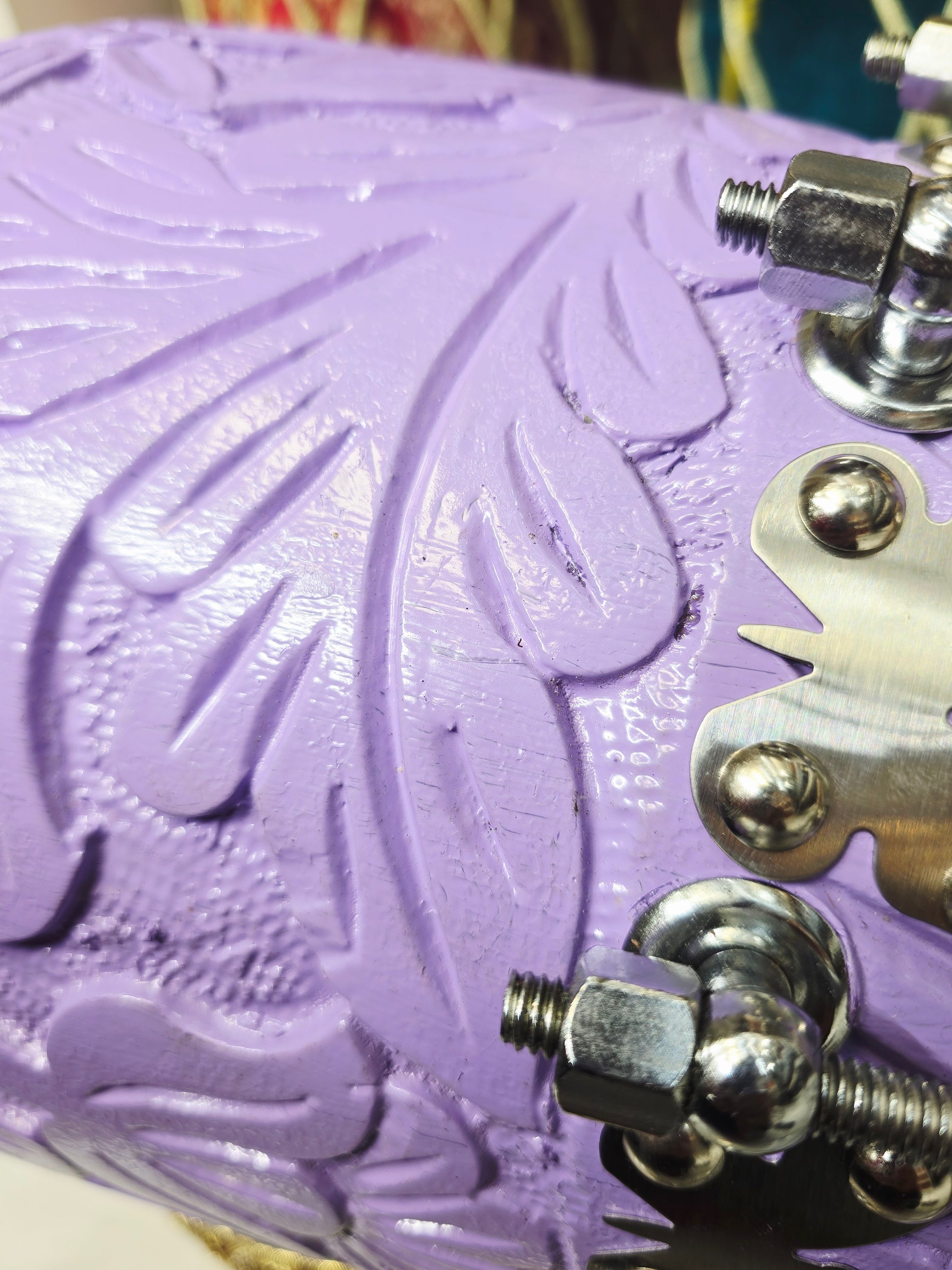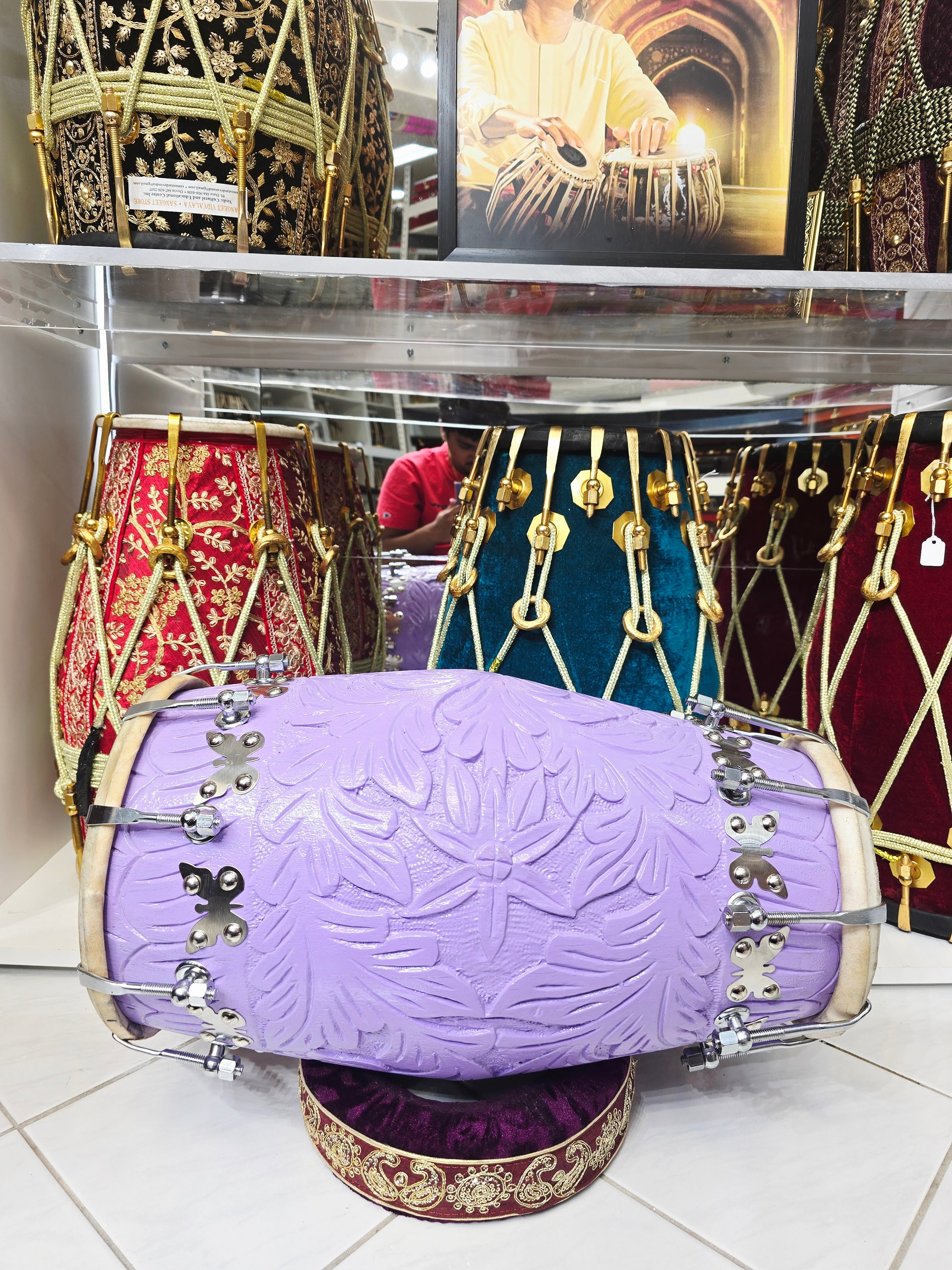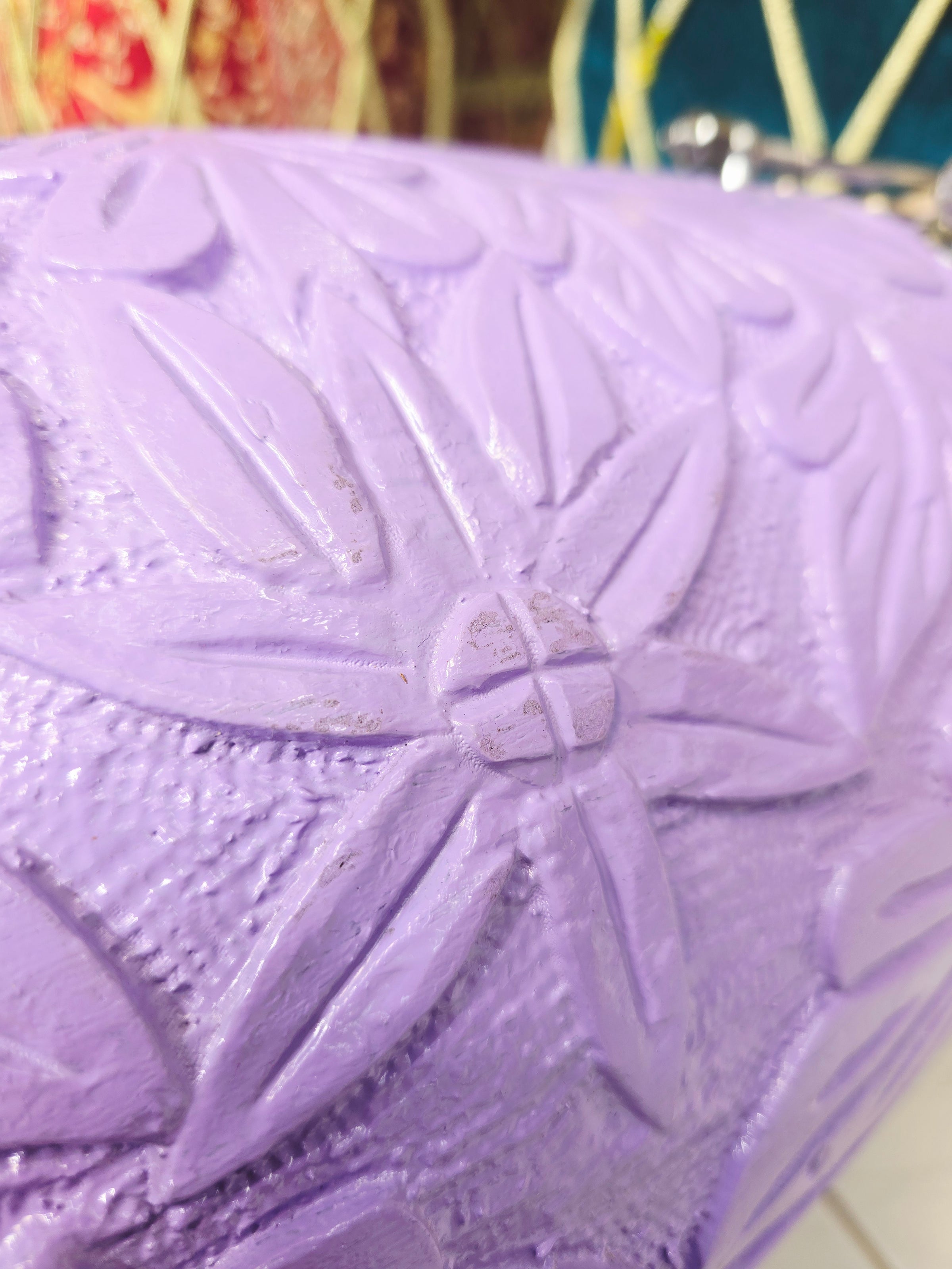 A rare fusion of grace and grit, Lavanya (meaning “grace” or “beauty” in Sanskrit) is a show-stopping 15.2lbs concert-quality dholak sculpted from dense red sheesham wood and wrapped in an enchanting lavender floral-carved finish. The delicately embossed botanical patterns are both tactile and ornamental, casting soft shadows across the pastel surface. Outfitted with polished chrome floral lugs and natural skins, this piece delivers sharp tonal clarity and full-bodied resonance, making it as performance-ready as it is visually poetic. Ideal for artists who see rhythm as an art form and their drum as a canvas.