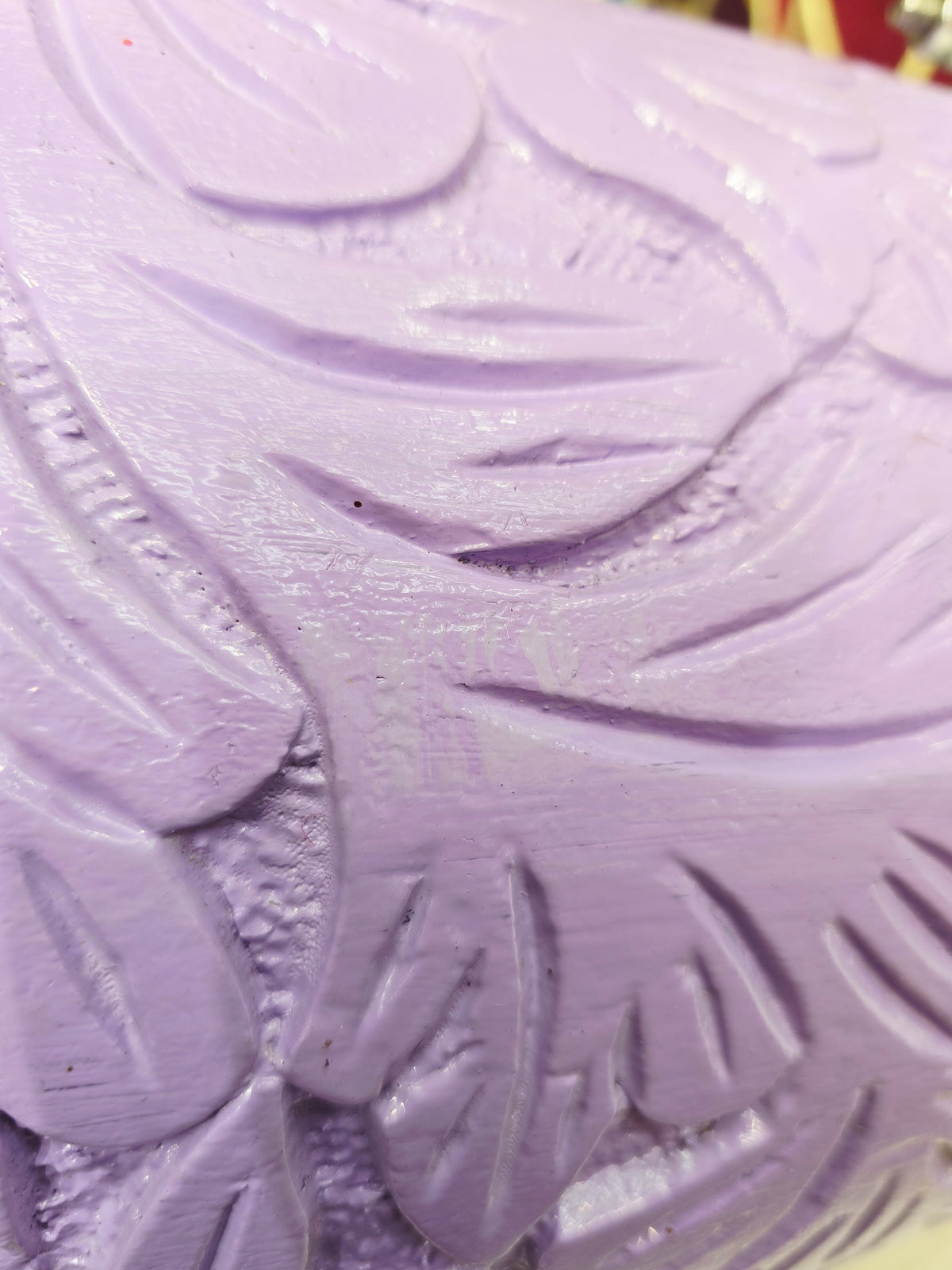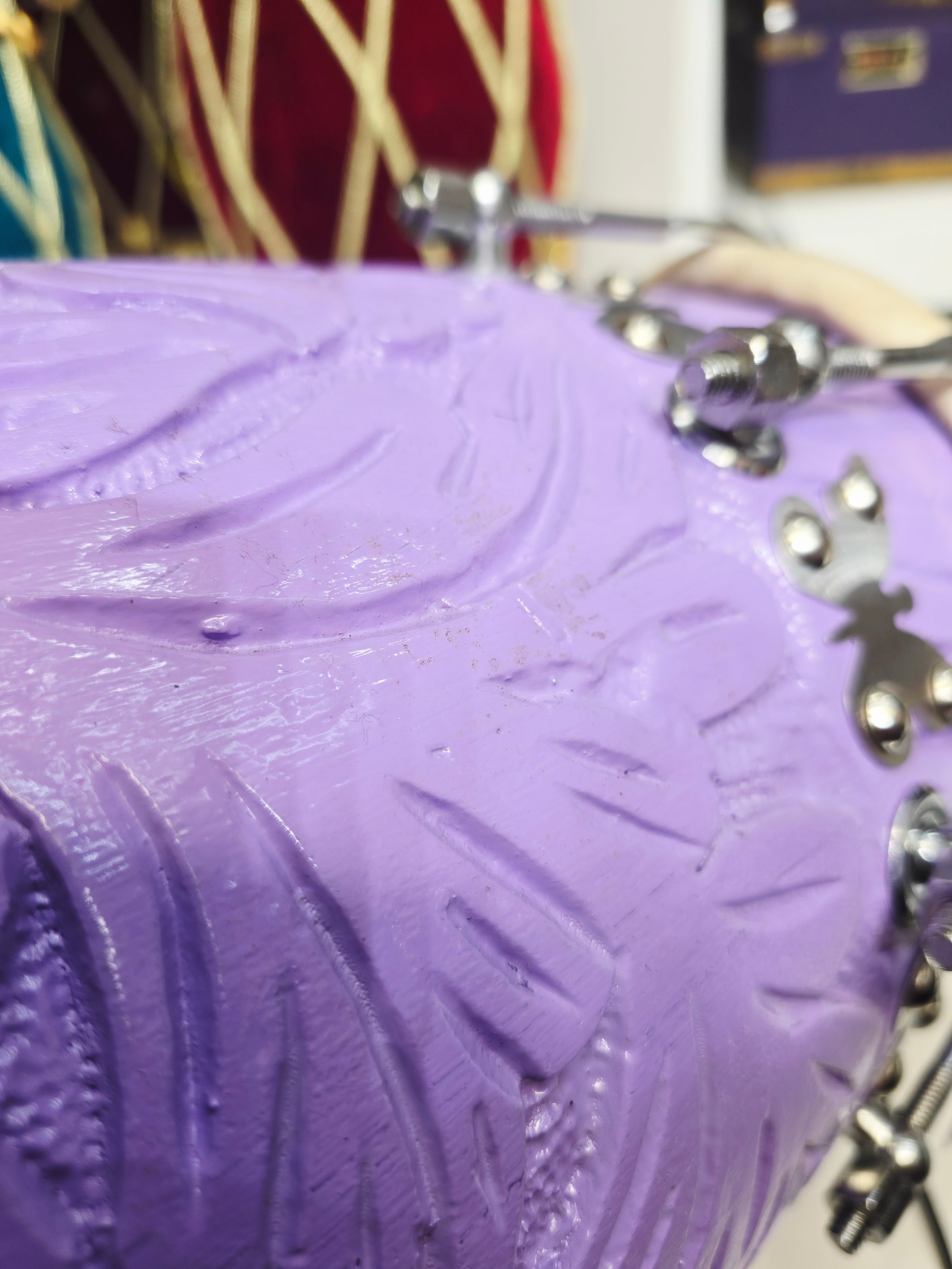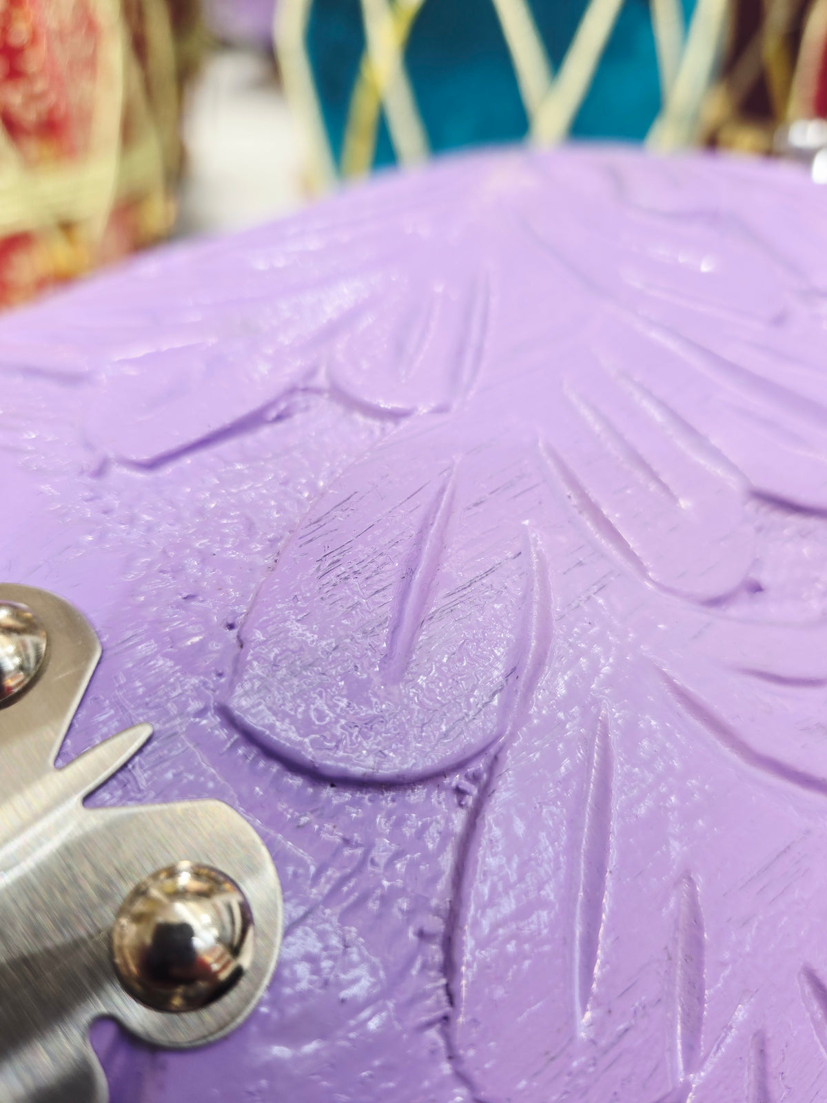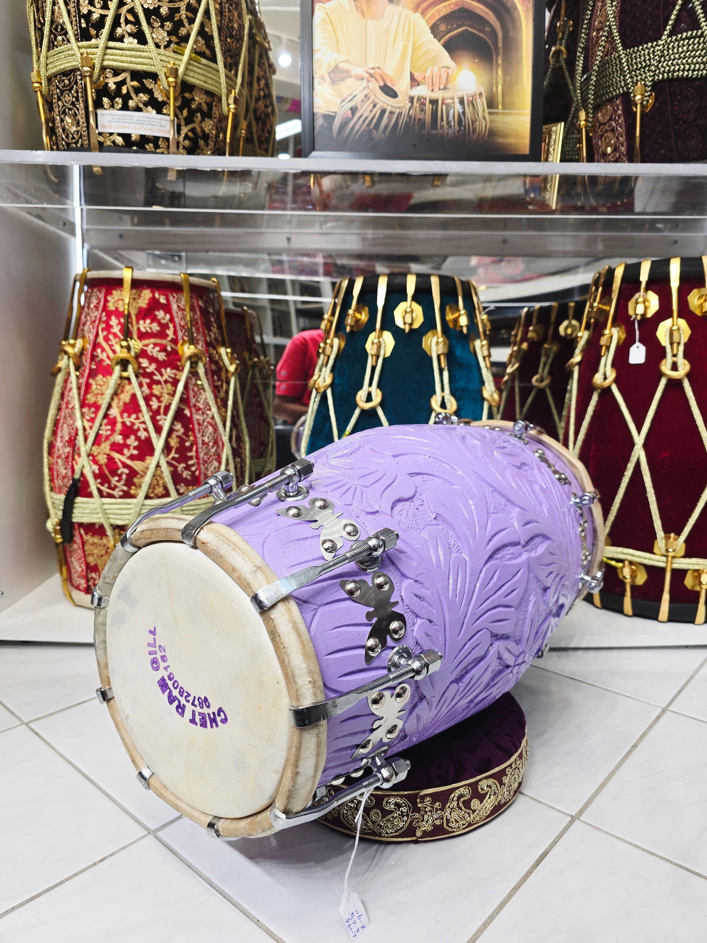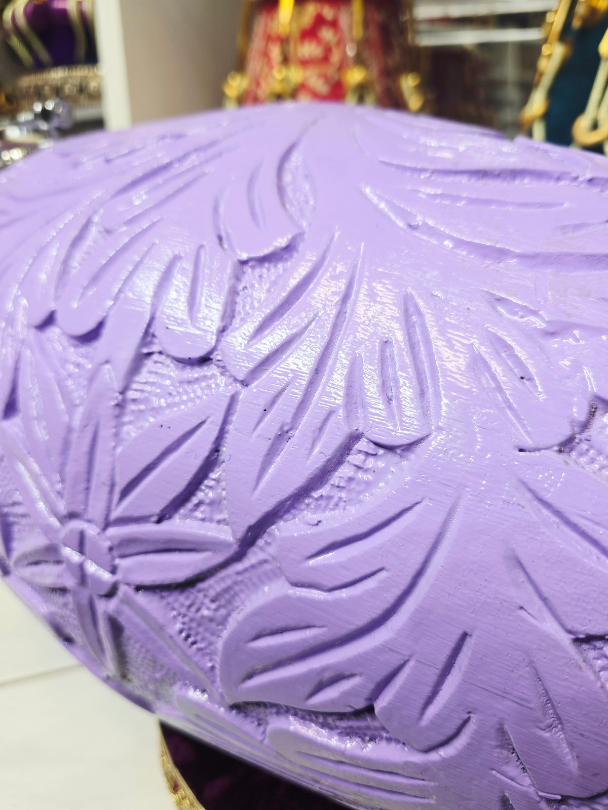 A rare fusion of grace and grit, Lavanya (meaning “grace” or “beauty” in Sanskrit) is a show-stopping 15.2lbs concert-quality dholak sculpted from dense red sheesham wood and wrapped in an enchanting lavender floral-carved finish. The delicately embossed botanical patterns are both tactile and ornamental, casting soft shadows across the pastel surface. Outfitted with polished chrome floral lugs and natural skins, this piece delivers sharp tonal clarity and full-bodied resonance, making it as performance-ready as it is visually poetic. Ideal for artists who see rhythm as an art form and their drum as a canvas.